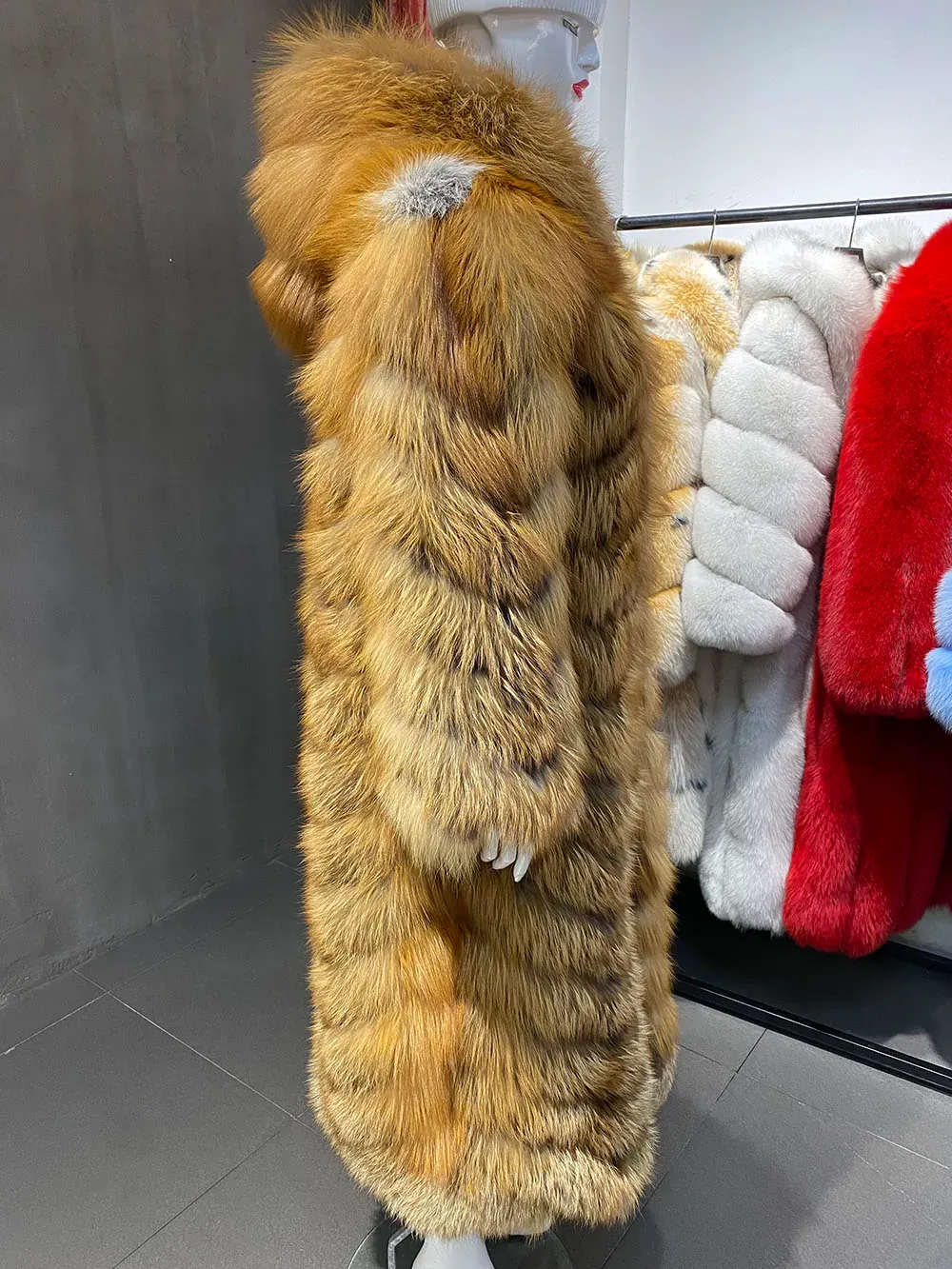 Luxury Full-Length Golden Fox Fur Coat with Oversized Hood