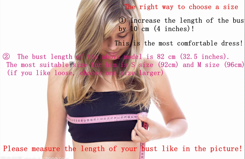 ①The correct way to choose a size is to or about 10 cm (4 inches) to your bust! This is the most comfortable to wear! ②The bust length of the above model is 82 cm (32.5 inches). The most suitable size for him is S size (92cm) and M size (96cm) (if you like loose, choose one size larger)