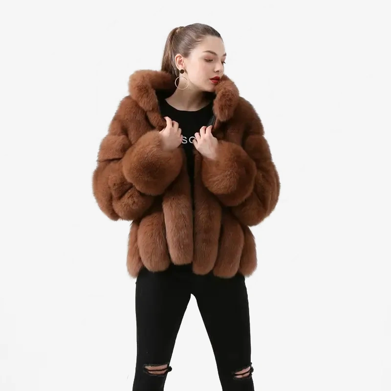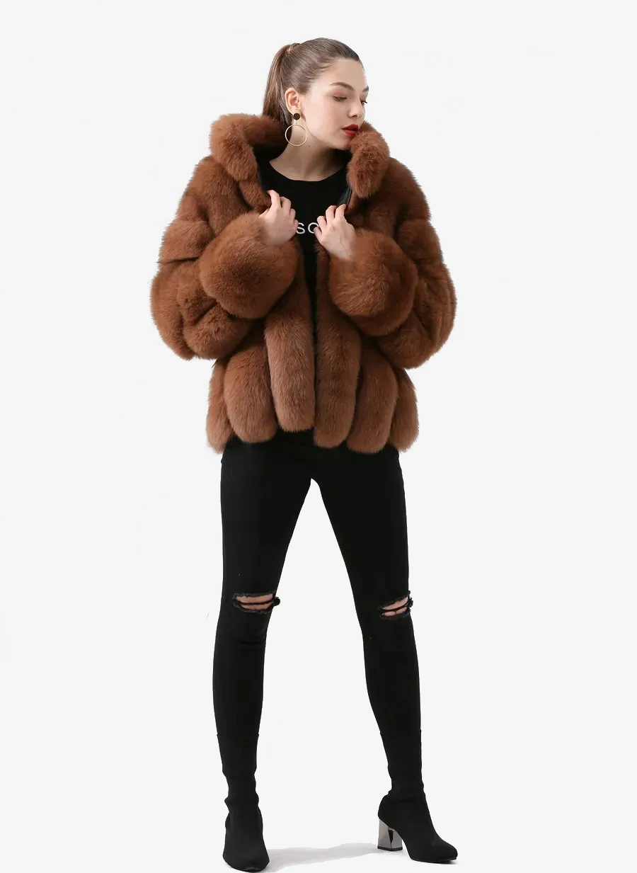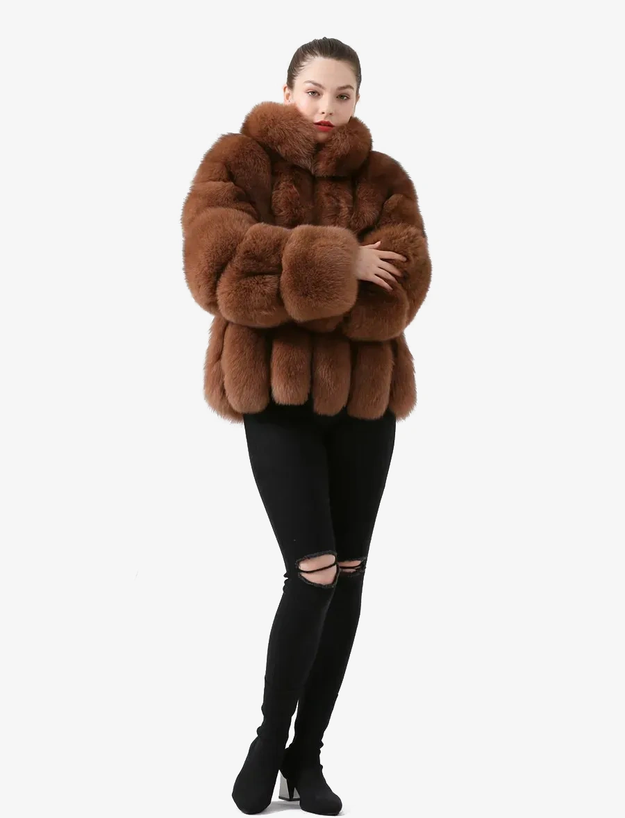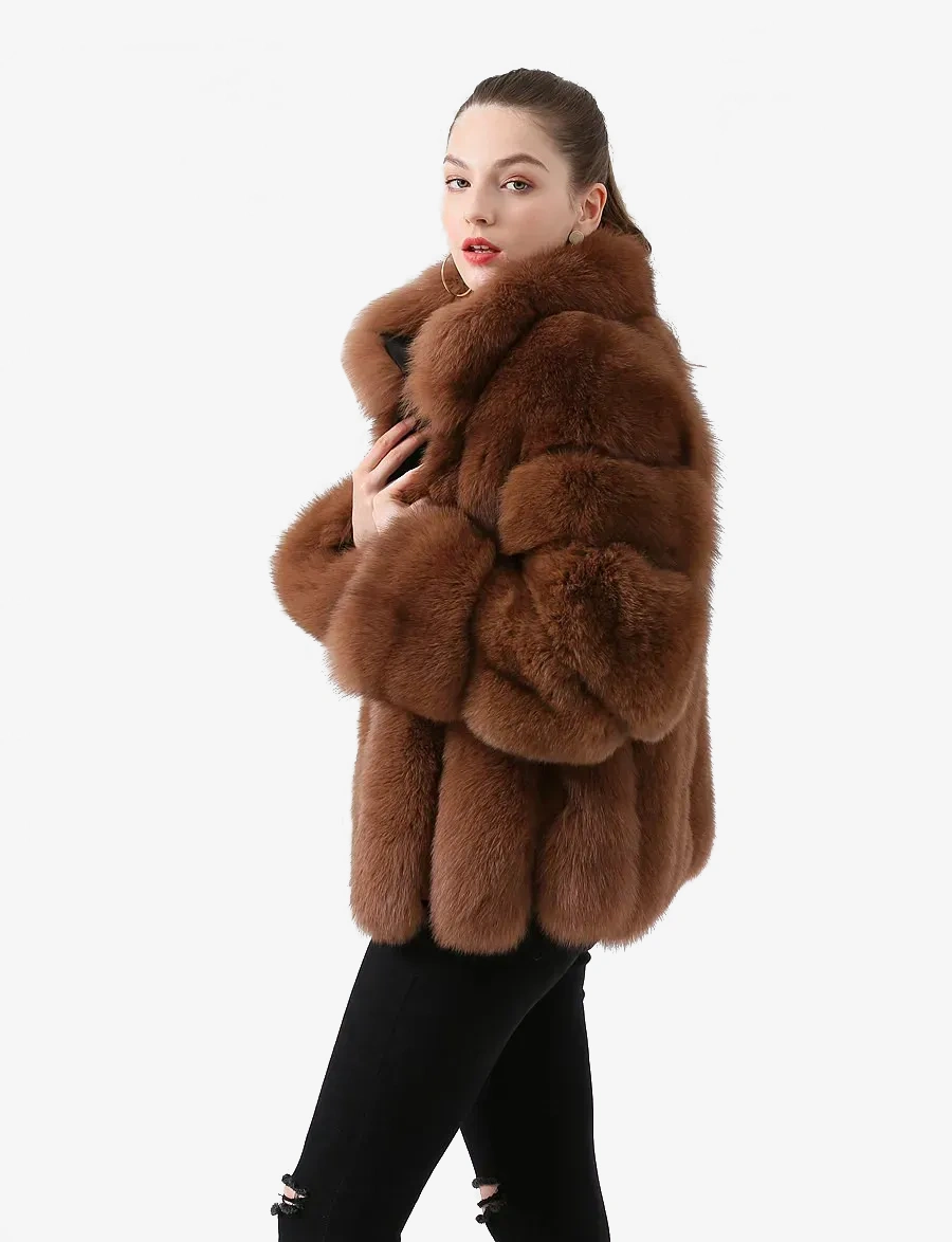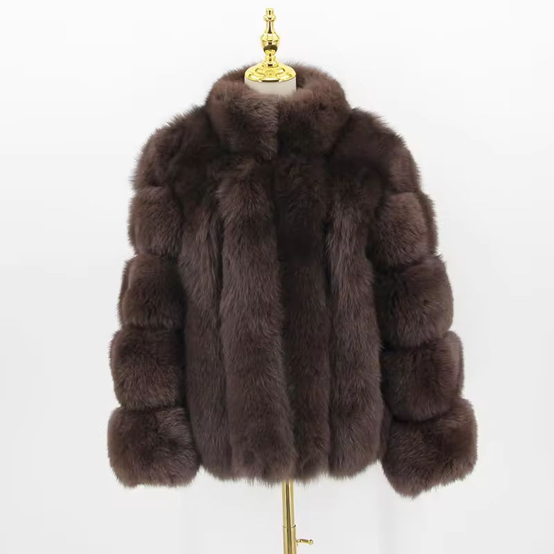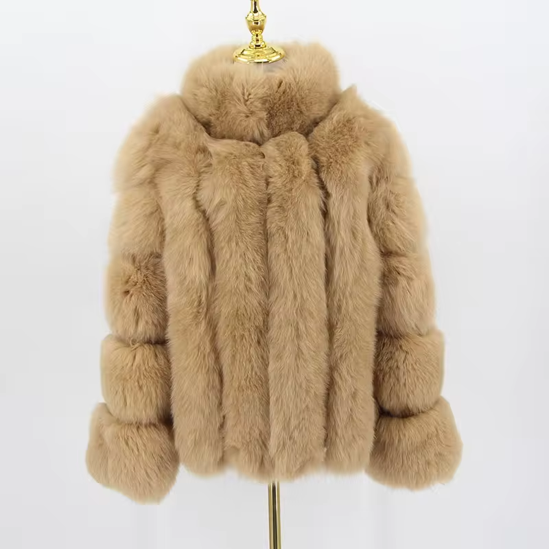 Real fox fur coat, natural fur leather jacket, long sleeved stand up collar
