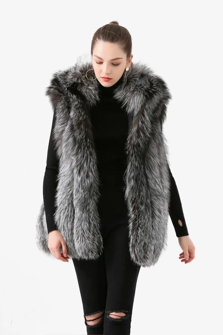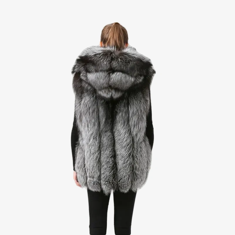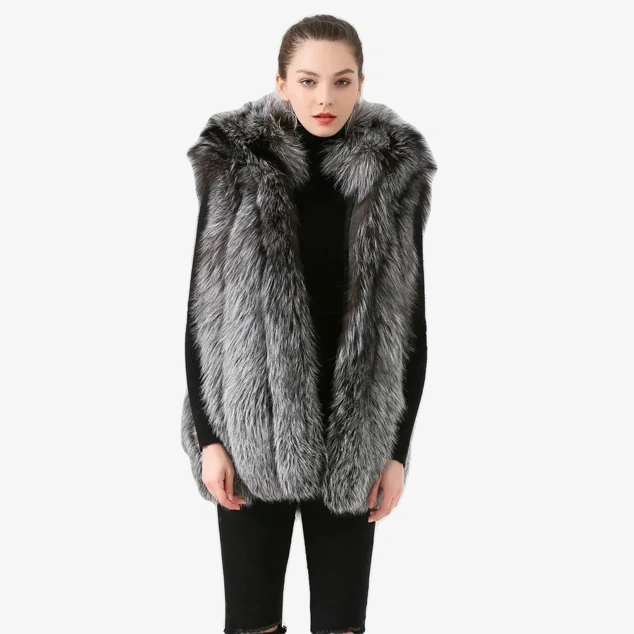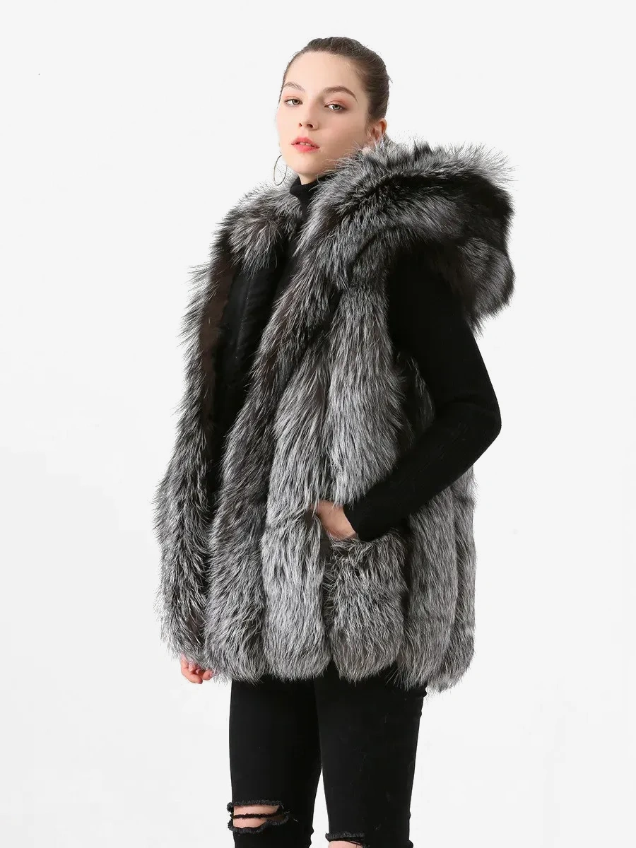 Women winter real fox fur vest fur hood gilet sliver fox fur coat